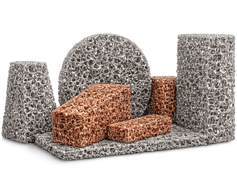Компания «ЭКАТ» предлагает пенометаллы на основе никеля и его сплавов (ферроникель, пенонихром), алюминия и меди.