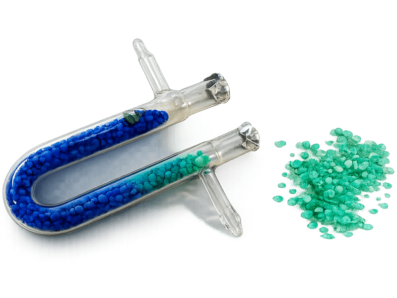 Во многих случаях химические поглотители марки ЭКАТ являются хромофорами. Такие поглотители изменяют цвет в процессе работы, сигнализируя об окончании срока службы и необходимости их замены, что избавляет Заказчика от дополнительных трат на проведение химических анализов.