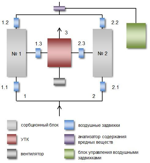 Такая циркуляция воздуха продолжается до тех пор, пока не вытеснится весь накопленный растворитель. Степень очистки УТК не менее 99%. Очищенный от растворителей воздух выбрасывается в атмосферу. Сорбционный блок № 2 в это время находится в работе, то есть процесс очистки и накопления не прекращается.