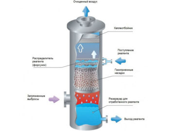 Далее охлажденный поток очищаемых выбросов направляется в гидрофильтр, внутри которого поток разворачивается и пролетает над поверхностью реагента. За счет разворота потока происходит его очищение от механических включений. Далее поток поступает в вертикальную колонну гидрофильтра, в которой размещены насадки лопаточного типа , по которым противотоком очищаемому воздуху стекает раствор реагента, непрерывно распыляющегося через систему форсунок, установленных в верхней части колонны. За счет мелкодисперсного распыления реагента и его равномерного распределения по сечению гидрофильтра достигается высокая степень очистки потока. В последующем капельная влага, содержащаяся в потоке, отбивается каплеотбойником, а очищенный поток отводится далее.