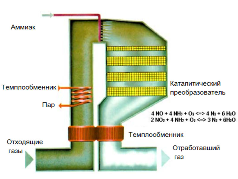 Аммиак вдувается в дымовые газы и превращает NOx в молекулярный азот (N2) и воду (H2O). Необходима температура выше 320 градусов Цельсия для предотвращения появления аммонийных солей, которые блокируются каталитическим преобразователем. На рис. 1 приведена типичная конфигурация каталитического преобразователя NOx в потоке.